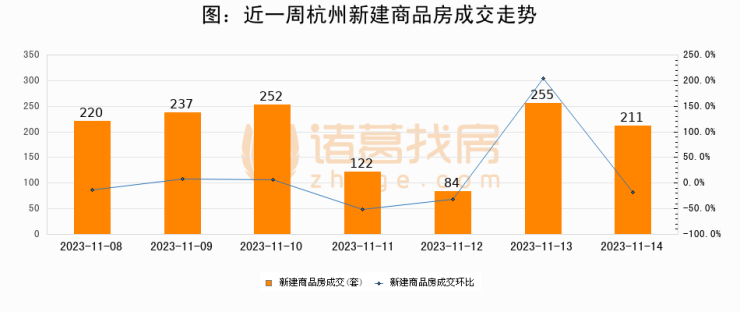 根据杭州市住房保障和房产管理局数据显示,2023年11月14日杭州新建商品房成交211套,较昨日减少44套,环比下降17.2%