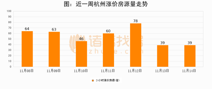 根据诸葛找房数据显示,杭州24小时涨价房源量为39套,较11月13日持平。