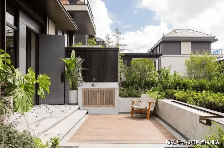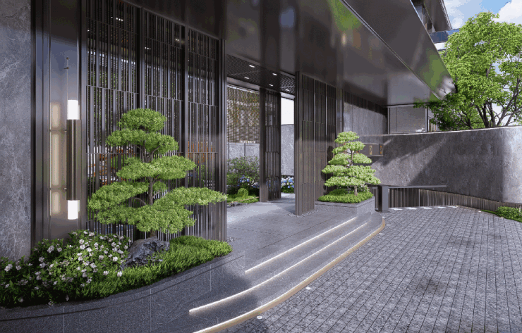 社区内“一轴双环六景”园林体系,中央景观轴+私家庭院,营造“出则繁华,入则宁静”的生活节奏