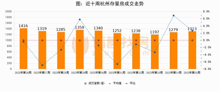 存量房方面,第35周杭州存量房成交1313套,较上周增加34套,环比上涨2.7%。从近十周成交走势来看,周均成交套数为1299套,本周高于平均水平1.1%。