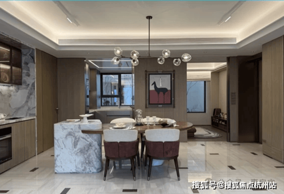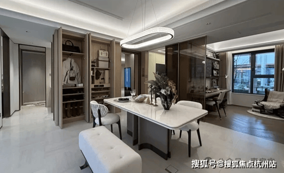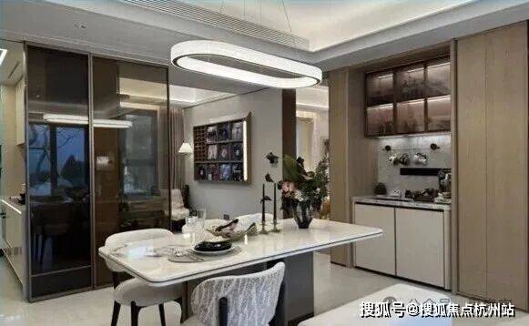 餐厅区域可轻松放置6人位餐桌,两侧还预留储物柜以及餐边柜空间,其实哪怕摆放一个8人位的大圆桌,也绰绰有余!