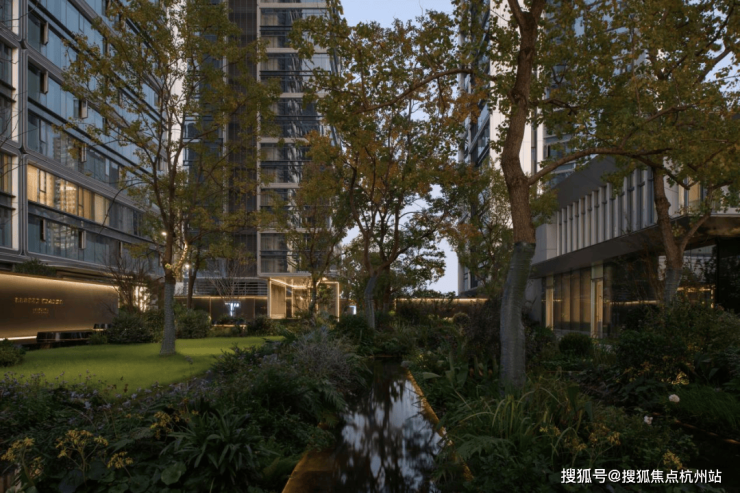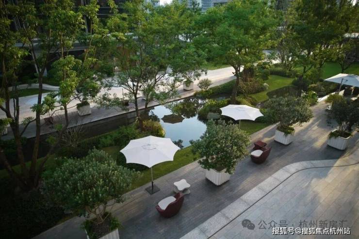 走入T-ONE潮博西区的园区,可以看到一条蜿蜒的水系串联着不同场景,贯穿整个楼盘。在这里,Pok是结合了杭州「钱塘江潮」的在地文化,用溪流与叠水打造出了一座很有度假感的花园。花园中,凡是有户外座椅的地方,就会有微风、树荫与水流的环绕。