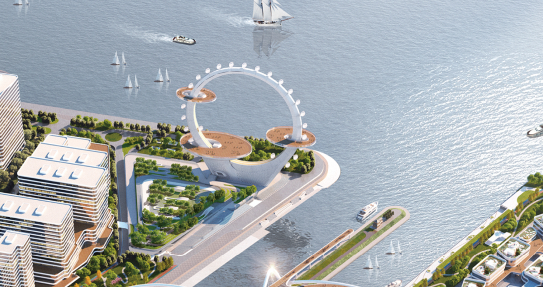 其中,东岸的摩天轮高达150米。摩天轮还设计了3个空中的看台,未来可以在此一览钱塘江两岸的壮丽风景。