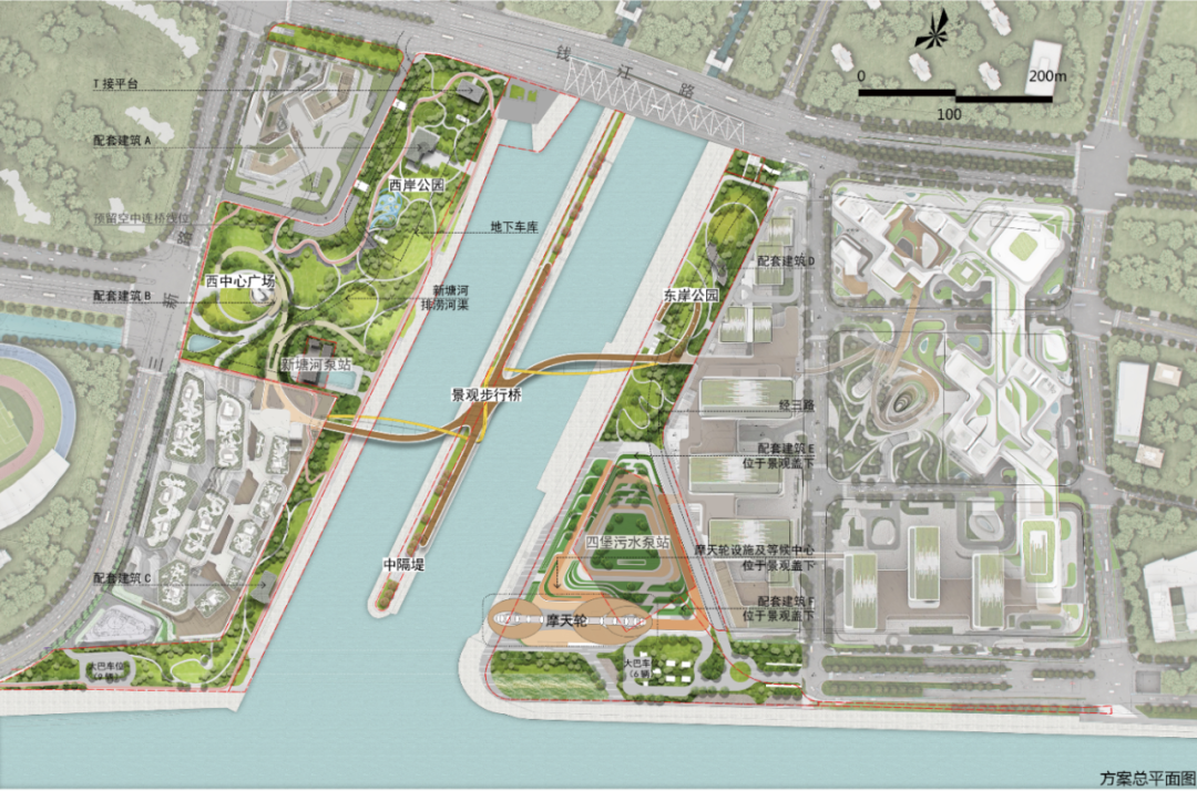 汇中部分规划有摩天轮、景观步行桥、中隔堤、东岸公园、西岸公园、西中心广场、新塘河泵站和四堡污水泵站等。