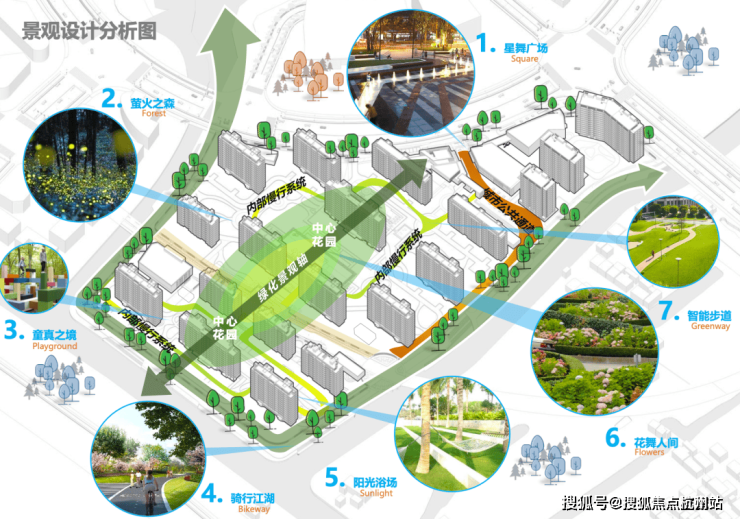 为了营造“森林家园”的居住理念,整个社区通过多维空间、全景化、人性化的居住氛围,设置了星舞广场、萤火之森、童真之境、骑行江湖、阳光浴场、花舞人间以及智能步道7大主体景观。