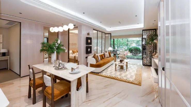 前沿中横厅设计实现 0 走廊、0 浪费, 餐厅 + 过道约5 米面宽 , 哪怕放6人桌仍留足过道空间,面积直接对标市面 130㎡以上户型。