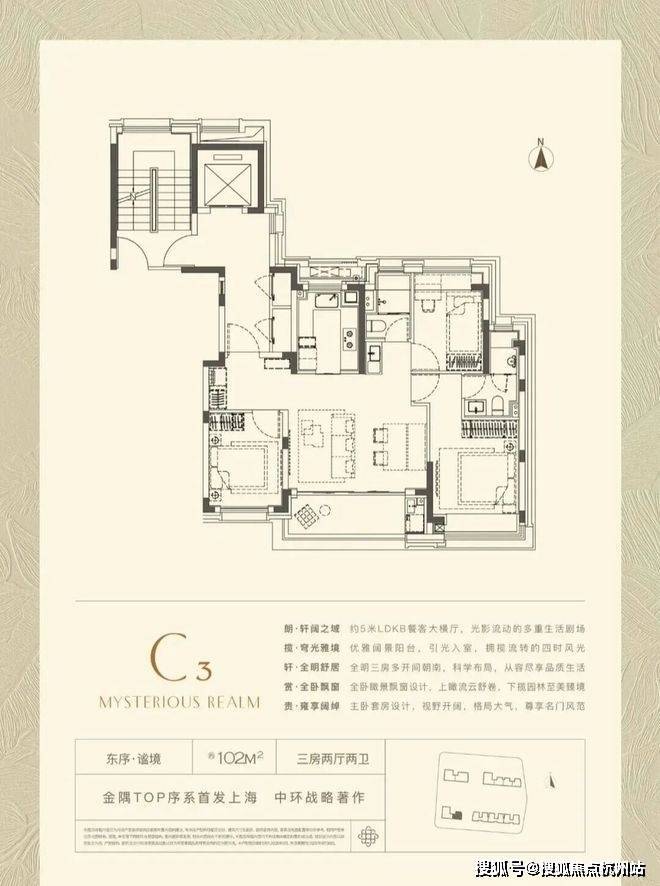 建面约102㎡三房:板块稀缺的“百平王牌”:随着上海“7090”政策取消,未来百平三房供应将大幅收紧,这款户型堪称桃浦板块的“稀缺资产”。其最大亮点是3.5开间朝南+约5米面宽LDKB超大横厅,配合全卧瞰景飘窗设计和独立电梯厅,实用面积极高-1-3。层高达到3.1米,远超常规2.9米,空间感跃升-3。
