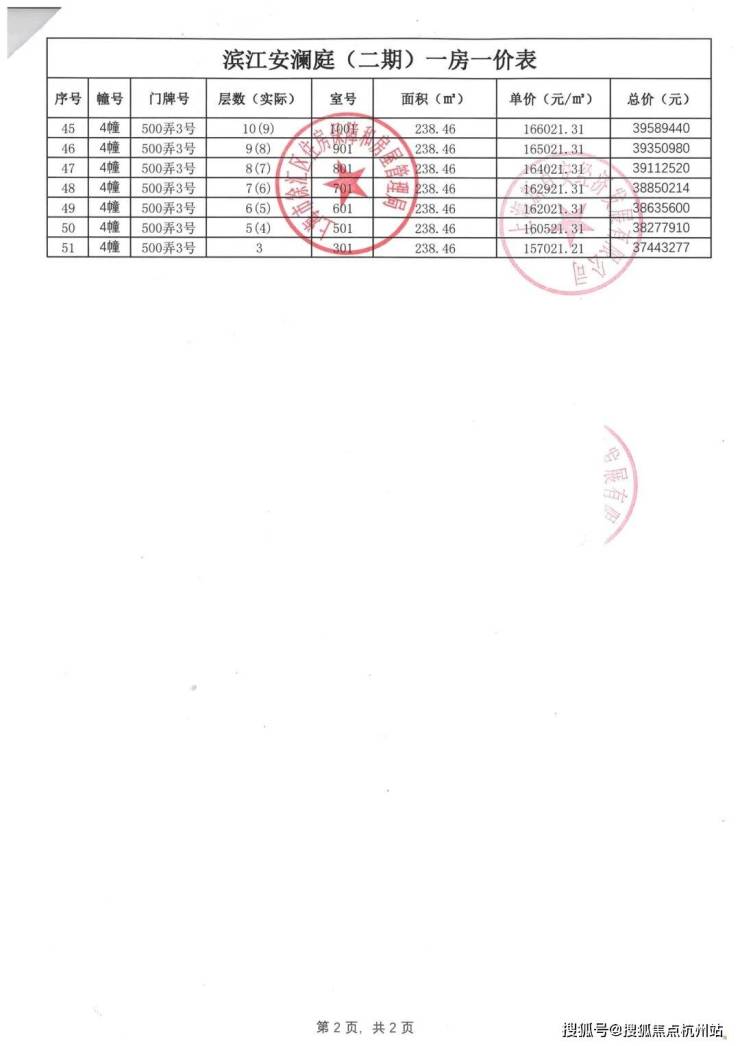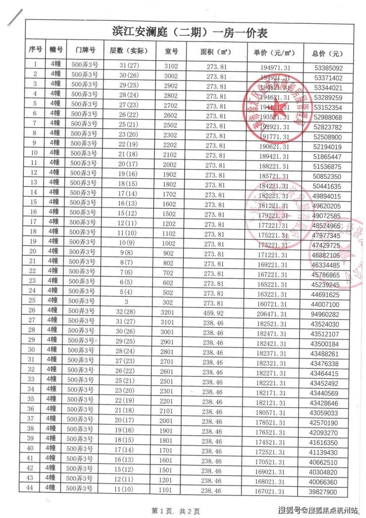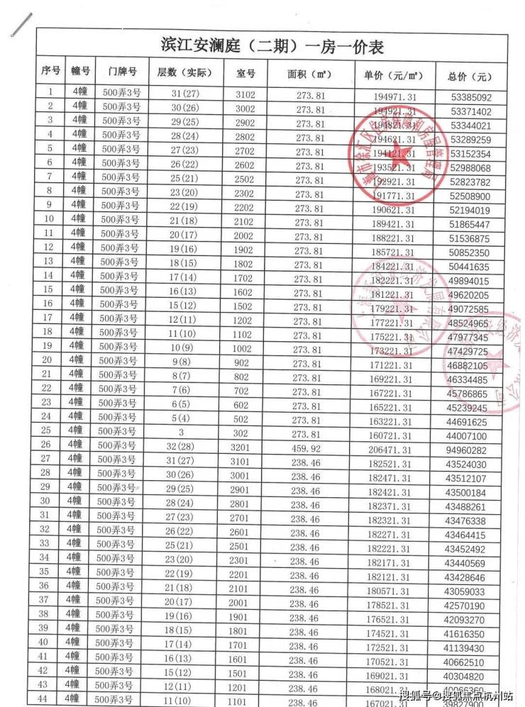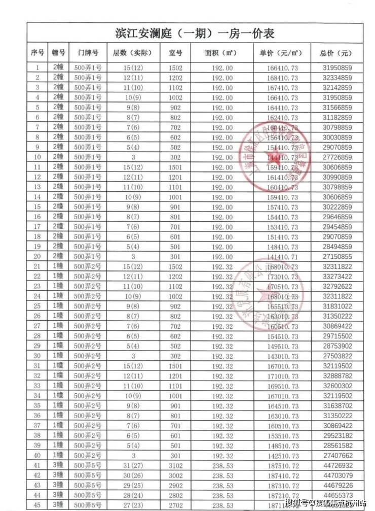 上期一房一价表如下: