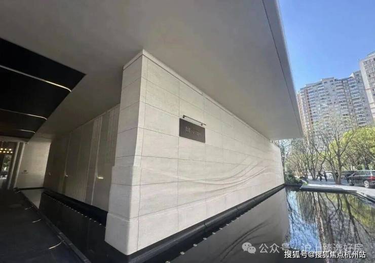 稍微走近一点就能看到采用了大量的弧形元素和石材材料。石材的质感本身就厚重,在上面叠加类似海浪的线条弱化了厚重感,反而显得轻盈。