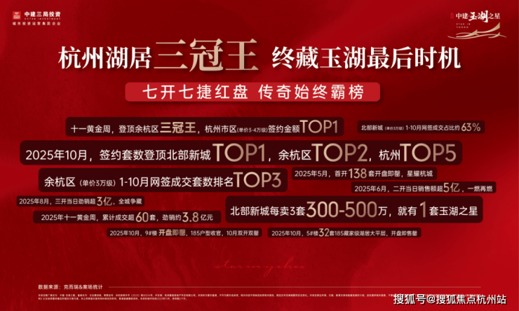 如果说“领誉”是品质的背书,那么“霸榜”就是市场最直接的投票。2025年,中建·玉湖之星将“热销”刻入项目基因,一整年的持续火爆,成就杭州楼市的“玉湖现象”。