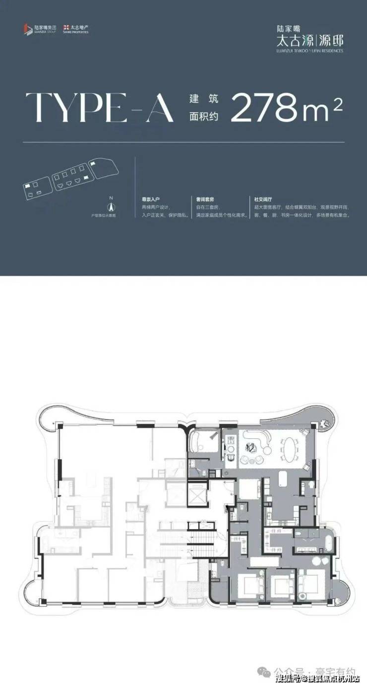 建面约278㎡户型,三套房设计可以满足家庭成员的不同居家需求,超大面宽客厅搭配蝶翼双阳台,观景视野开阔。