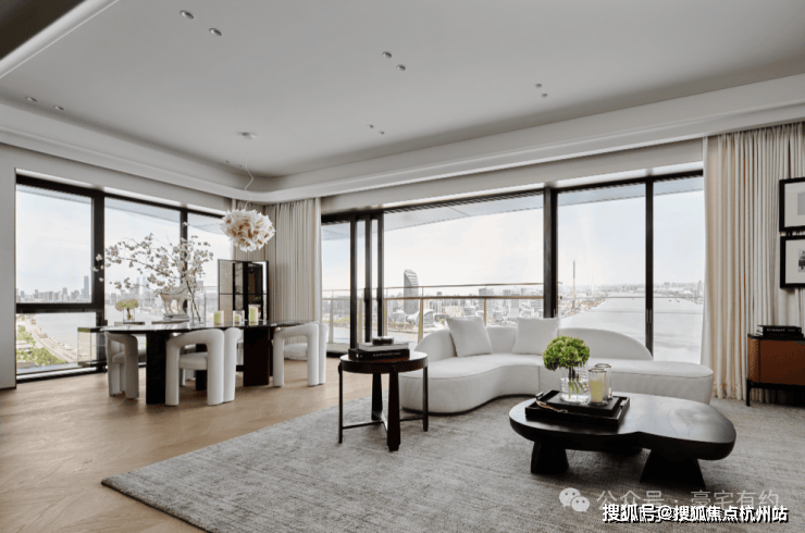 项目290㎡样板间拥有约9.65米超大客厅面宽,搭配蝶翼双阳台,西瞰陆家嘴摩天天际,东赏百年码头人文底蕴,北望黄浦江浩渺江景,环幕视野拉满。