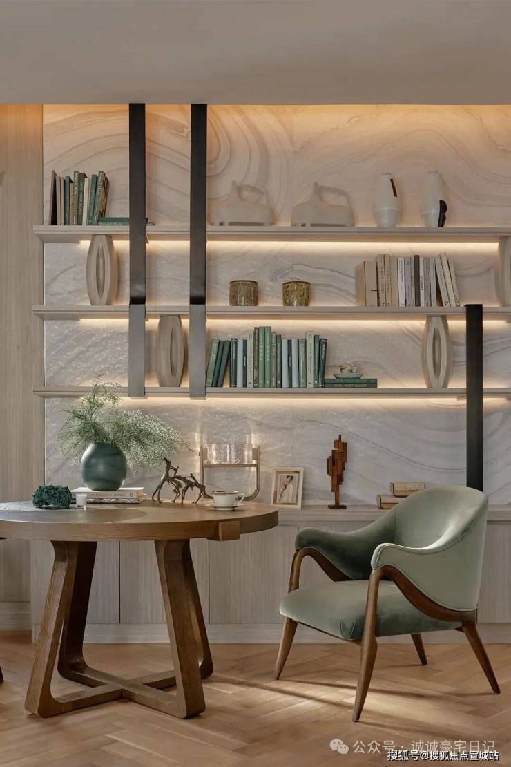 夹层被安置成了书房,安静、雅致,为了显露对生活的慰藉,像是把精神世界现实化的地方,展现修养、审美甚至家风。也如三毛在《送你一匹马》中所说:“许多时候,自己可能以为许多看过的书籍都成过眼烟云,不复记忆,其实他们仍是潜在的。”