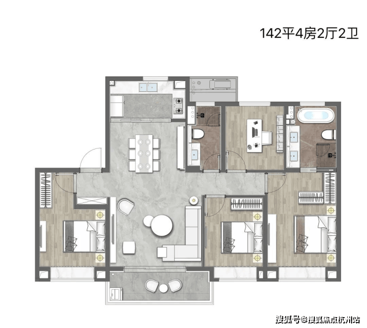 主卧套房为生活的精致体验感充分考虑, 主卫双台盆的配置,预留浴缸放置区, 关上房门就是主人的“小世界”。