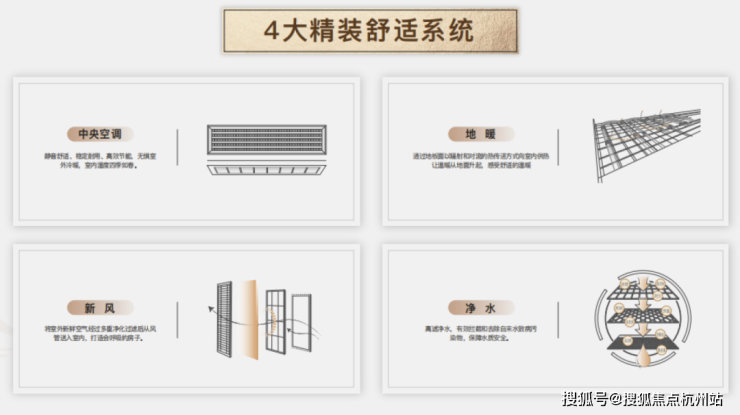 精装现房:精装交付标准达 3000 元 / 平方米,配备中央空调、地暖、新风、净水四大系统,即买即住。