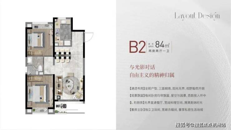 做到了三开间朝南+双阳台设计+主卧套房设计+南北通透,该户型得房率非常高。