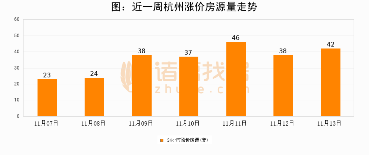 根据诸葛找房数据显示,杭州24小时涨价房源量为42套,较11月12日增加4套,环比上涨10.5%。与此同时,涨价房源占比小幅扩大,业主信心有所提升。