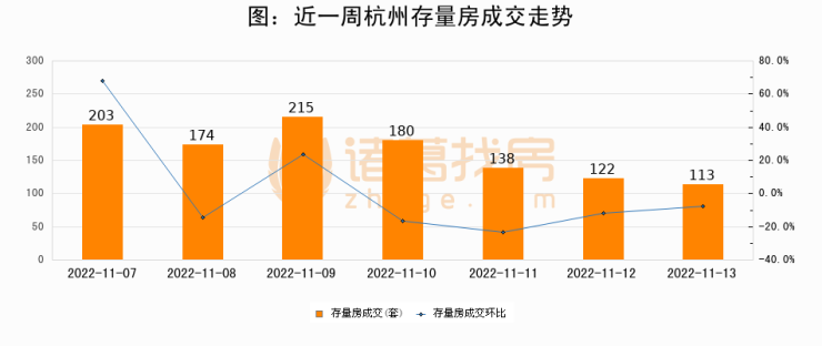 从存量房来看,2022年11月13日杭州存量房单日成交113套,比昨日减少9套,环比下降7.4%。从近一周存量房成交来看,杭州存量房日均成交套数为163套,其中11月09日成交量最高为215套,11月13日单日成交113套,低于近一周平均水平30.7%。