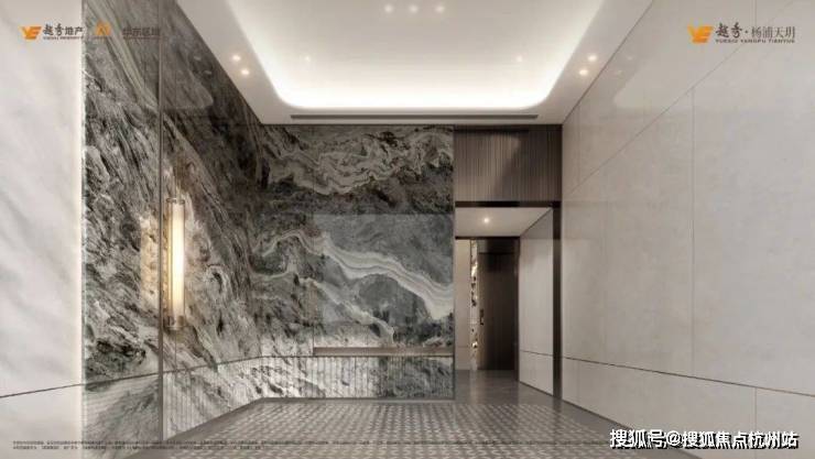 入户大堂:大面璀璨星河奢石、高山流水地砖、通高门头电梯、弧角叠级吊顶等叠加,超12万项目才会有的配置。