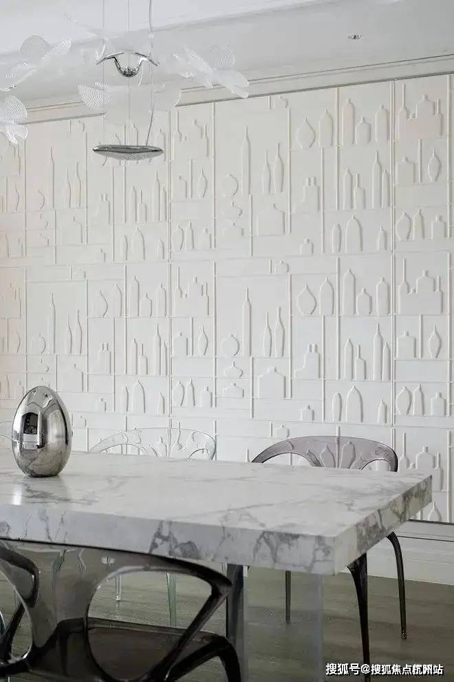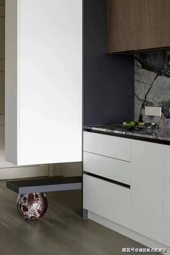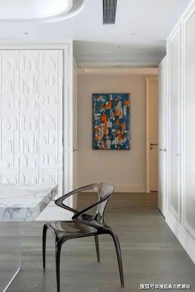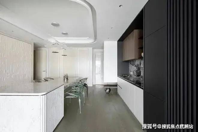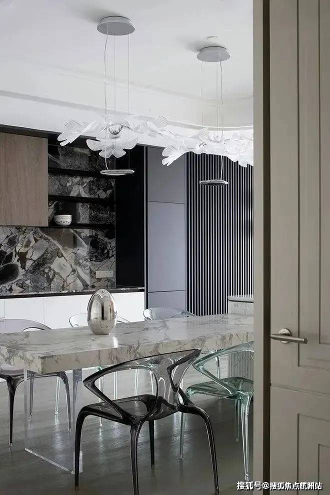 就餐厅暂离传统的固定设计方式,采用更新颖的设计方法缔造潮流惊喜。餐桌联合岛台,扩展用餐面积,赋予更加灵动洒脱的形态。另外通透亚克力支柱呈现的隐身姿态,赋予空间更温馨淡然的氛围。