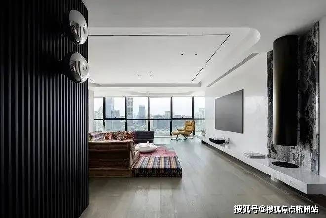 弧式吊顶联同艺术圆状壁炉,实现柔化效果,转而融入整体家具风格之中。每一处空间角落,皆彰显着统一格局,迎合顺畅流线的渲染,构建出非常完整的温馨家居环境。