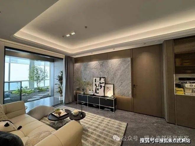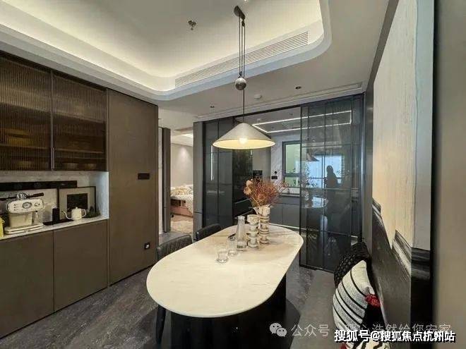 餐客厅是这个户型的一大亮点, 餐厅空间目前放的是4-6人长桌,小编现场估摸着放个一米左右的圆桌是可行的。这个餐边柜的开放格采用了鱼肚灰石材装饰也是交付标准之一。