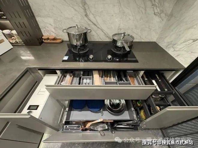 厨房收纳是小编觉得非常实用的款式。比如蒸烤一体机上方的橱柜做了一个下拉篮,下拉后的高度,一个一米六个子的人无需踮脚即可拿到东西。