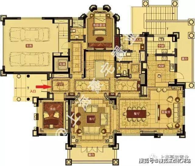 再看入户大门,1.8米双开门,高门大户,与文艺复兴时期梁柱、拱圈搭配,庄严对称。六级台阶拾阶而上,象征家庭顺利和谐,事业蒸蒸日上。