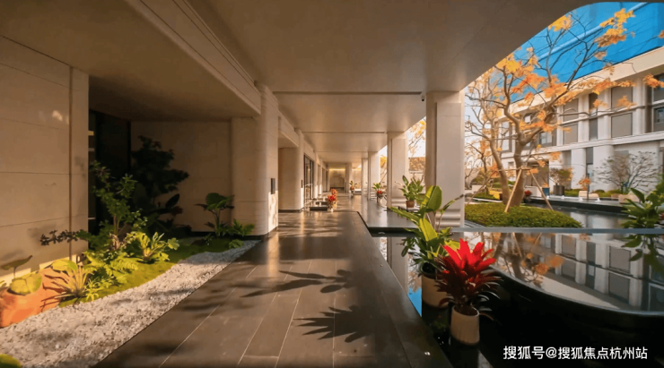 超千方镜面主题水院,时刻演绎自然与建筑的无界之美:澄澈镜面水面倒映建筑肌理与天光云影,搭配三株原生丛生乌桕的点缀,与回廊、浮岛相映成趣,营造出静谧雅致的亲水意境,这种沉浸式水景体验生活,在张江高端住区中尤为稀缺。