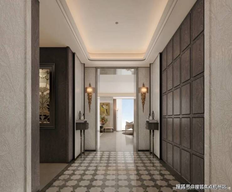 而且这个空间的装标也是非常精致的,1.7米双扇铸铝门,搭配宝格丽石材与祥云灰拼花,延伸至电梯厅。皇家白玉石玄关,兼具储物与展示功能,质感温润。