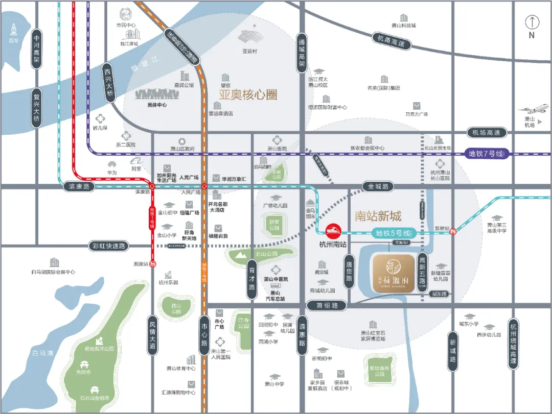 双地铁口配置,其直线约500米,是已经开通的地铁5号线杭州南站站,5站到奥体,6站滨江;约600米外,则是5号线双桥站。