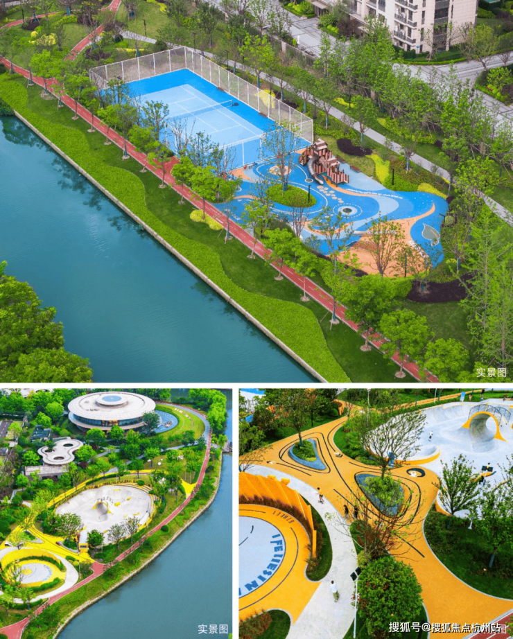 无限活力的滨江公园: 家门口约20万方滨江公园,涵盖3km滨江步道、约1300㎡滑板公园&篮球场、家楼下网球场、亲子乐园与露营基地等多元场域,共同构成一座全域、全龄、全时的活力之城。