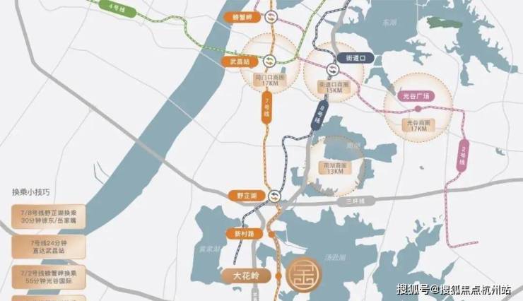 7号线直达武昌火车站、螃蟹岬,在武昌火车站与4号线换乘,螃蟹岬与2号线换乘,再远一点就是武昌滨江、汉口三阳路、香港路、CBD了,也可在野芷湖与8号线换乘到街道口商圈。