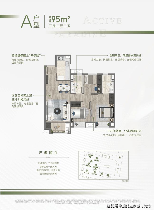 1、约95㎡的三房,南北通透,全明设计,三开间朝南,户型方正。