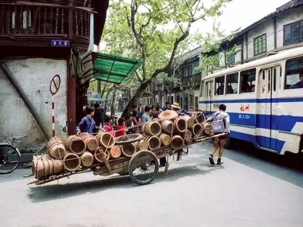 1981年,杭州华光巷,公共汽车与装满陶罐的板车。