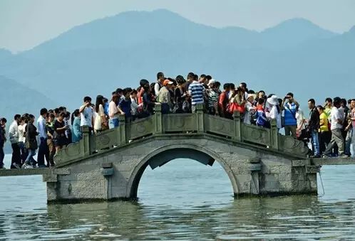1999年10月1日,杭州西湖断桥上的游客。