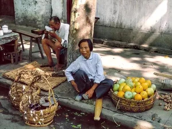 1981年,杭州,农民在人行道上售卖瓜果。