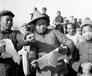 1950年,杭县(今属杭州市)临平区,土改工作队的工作人员(左)带领农民进行分田。