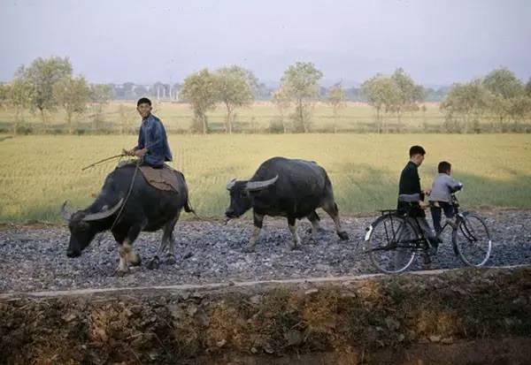 1973年9月,杭州,放牛娃与骑自行车的行人。布鲁诺·巴贝/摄。