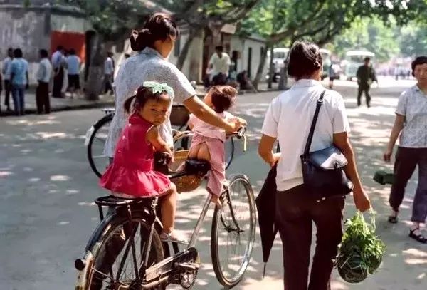 1981年,杭州,日落时孩子坐在自行车上,被妈妈从幼儿园接回家。阿德里亚诺•马达罗/摄。