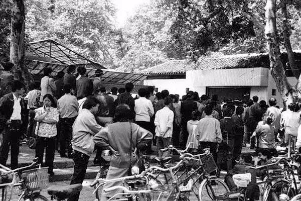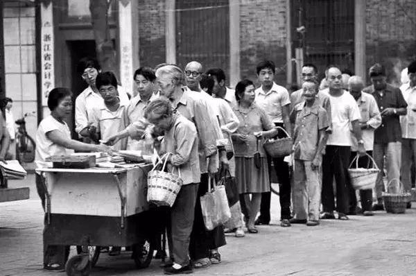 1987年,杭州,大家排队买报纸,那时的报纸和食品一样的紧张。