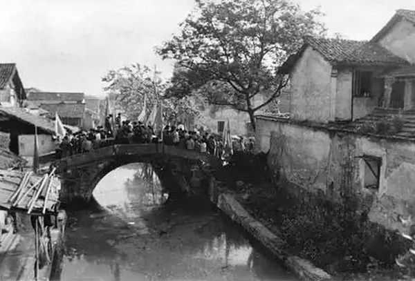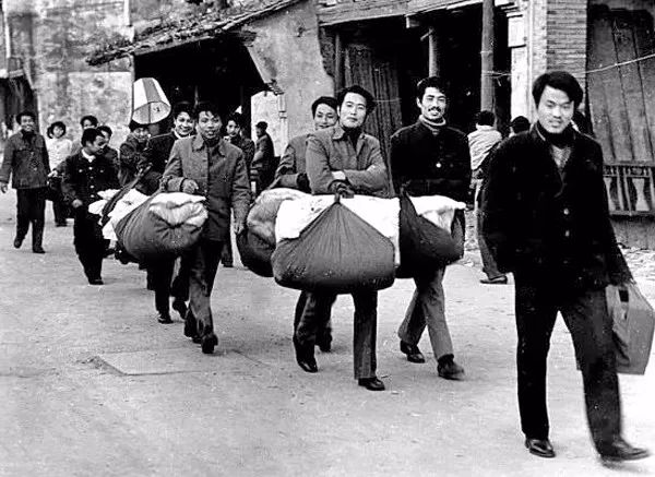 1970年代,杭州近郊塘栖镇,一户家庭,提着用布包裹的棉被、衣服,浩浩荡荡送嫁妆。叶国兴/摄。