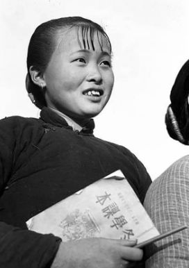 1950年12月,杭县(今属杭州市),农村冬学普遍展开。图为挟着课本上学去的农村妇女。王纯德/摄。