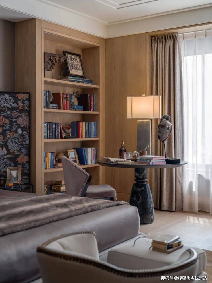 多功能书架彰显着设计的巧思,形成有如博物馆般的展示方式,即可放置日常读物,亦可展示珍本藏书。同时,利用屏风做隔断,与圆桌结合形成私密空间。