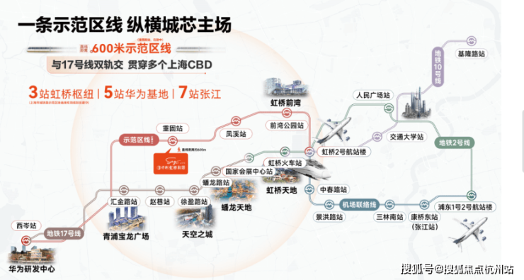 示范区沿线汇聚大量高能商业。2到到前湾芳乐路TOD,有开市客及前湾印象城(在建),3站到虹桥枢纽,则有虹桥天地及龙湖天街等。另外徐盈路天空之城、徐泾蟠龙天地、百老汇等也能快速抵达。