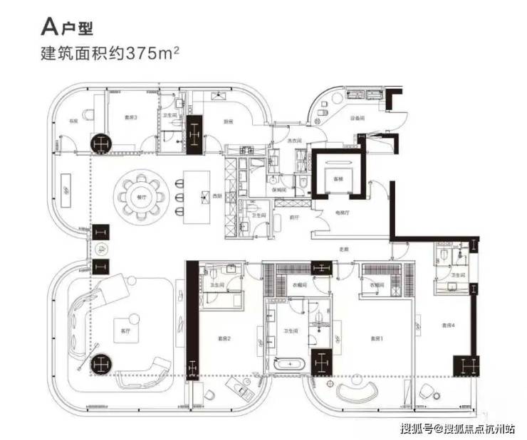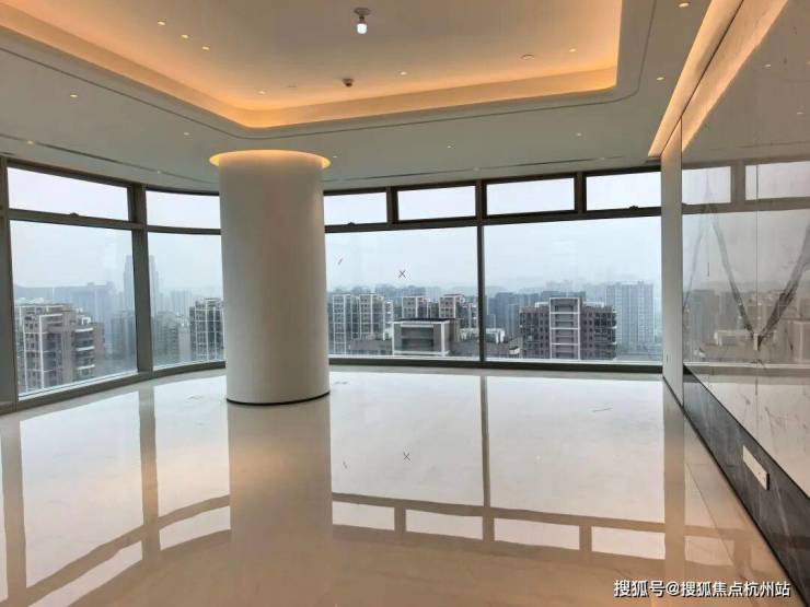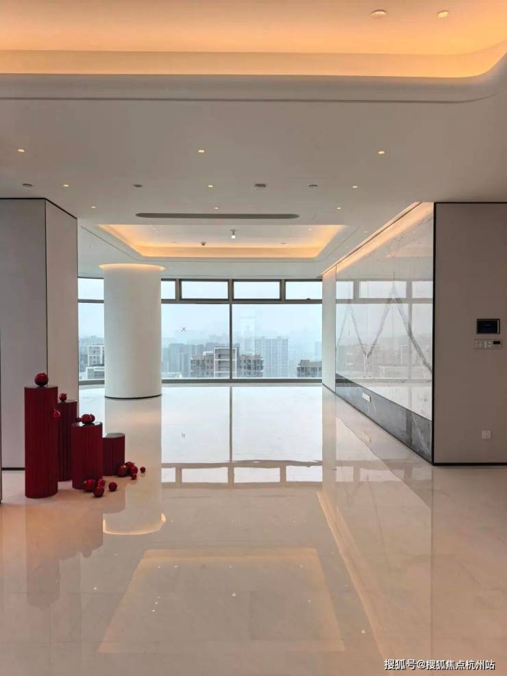 项目只有一个375方的户型,一梯一户,独立电梯厅,据说赠送面积有107m²。层高约3.8米,南向开间约24米,在尺度上和视野上几乎是无敌的,一定说有什么不足,就是客厅的几根大柱子,确实会影响一些视野和空间感。