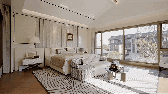 走进约 258㎡联排样板间,便能感受到空间的阔绰与尊崇:一层约3.6m层高,让室内空间尽显通透,告别压抑;客厅大面宽设计,让阳光与园林景观自然入户,将窗外风光化作室内画卷。