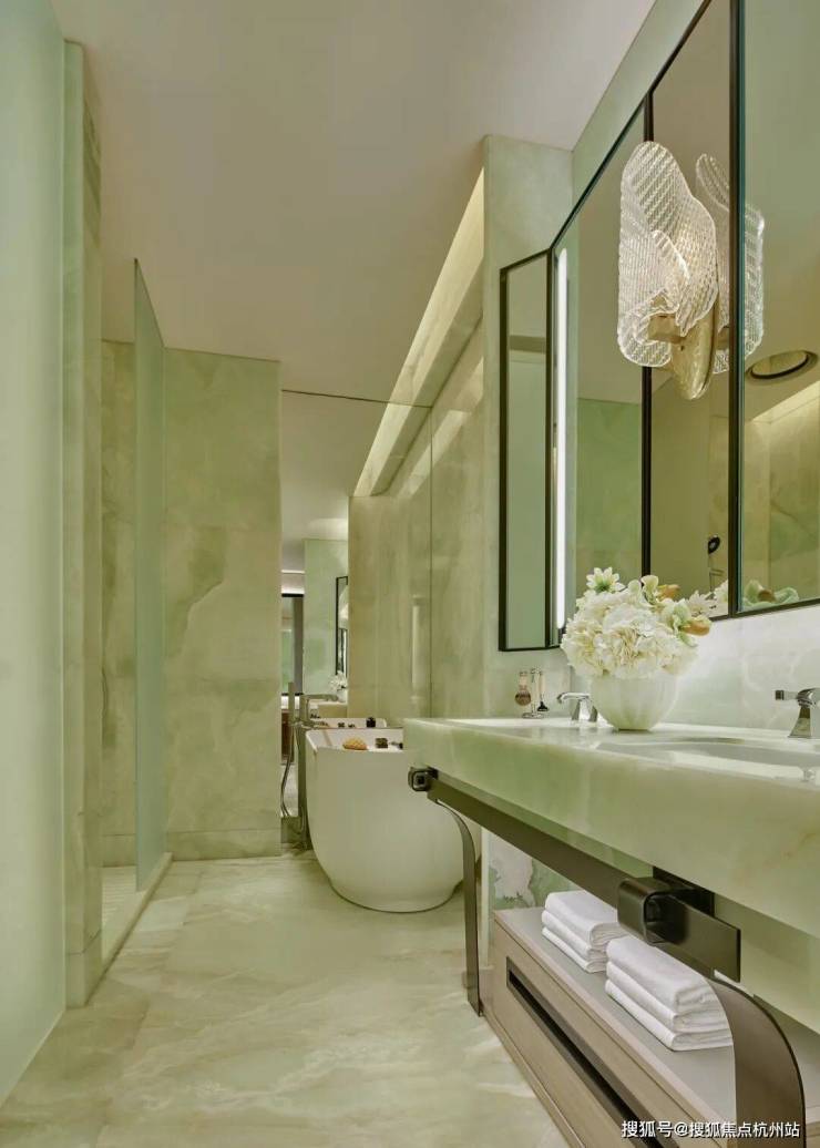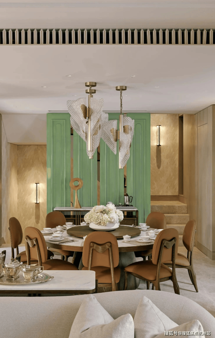 顶层下午茶区以淡绿为底,壁炉暖光漫过手绘地毯的肌理,将社交场域沉淀为冥想容器;主人房墙面缟玛瑙(Onyx)的天然流痕,也与一层屏风暗纹形成时空对位,光影在矿物晶体中生长出私密的诗。