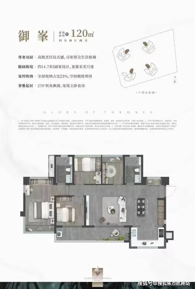 120㎡的4房2厅2卫,设计的是横厅南北通透格局,客餐厅开间8米,约14.7米超幕视野,超长阳台,主卧转角270°大飘窗,U型厨房,得房率:78.99%(不含赠送),阳台主朝西南或东南向。
