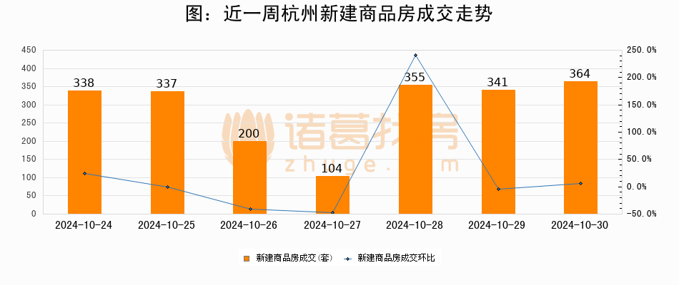 根据杭州市住房保障和房产管理局数据显示,2024年10月30日杭州新建商品房成交364套,较昨日增加23套,环比上涨6.7%。近一周杭州新建商品房日均成交292套。10月30日单日成交364套,高于近一周平均水平24.7%。
